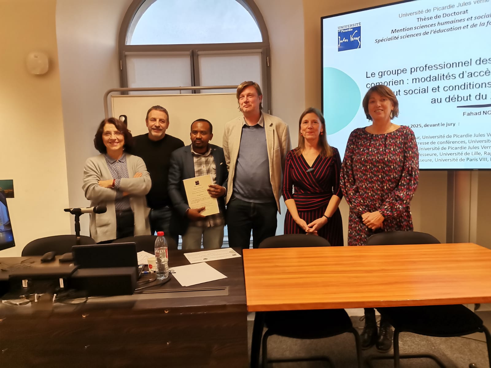 Ce vendredi 19 décembre 2025 s'est tenue à Amiens, en France, la soutenance de doctorat de Monsieur Nour Fahad, membre fondateur de notre association. Son travail de recherche s'inscrit dans une analyse approfondie de l'évolution des politiques éducatives comoriennes au cours des trente dernières années, mettant en lumière les dynamiques structurelles, les choix institutionnels et leurs effets sociaux sur le système éducatif national.